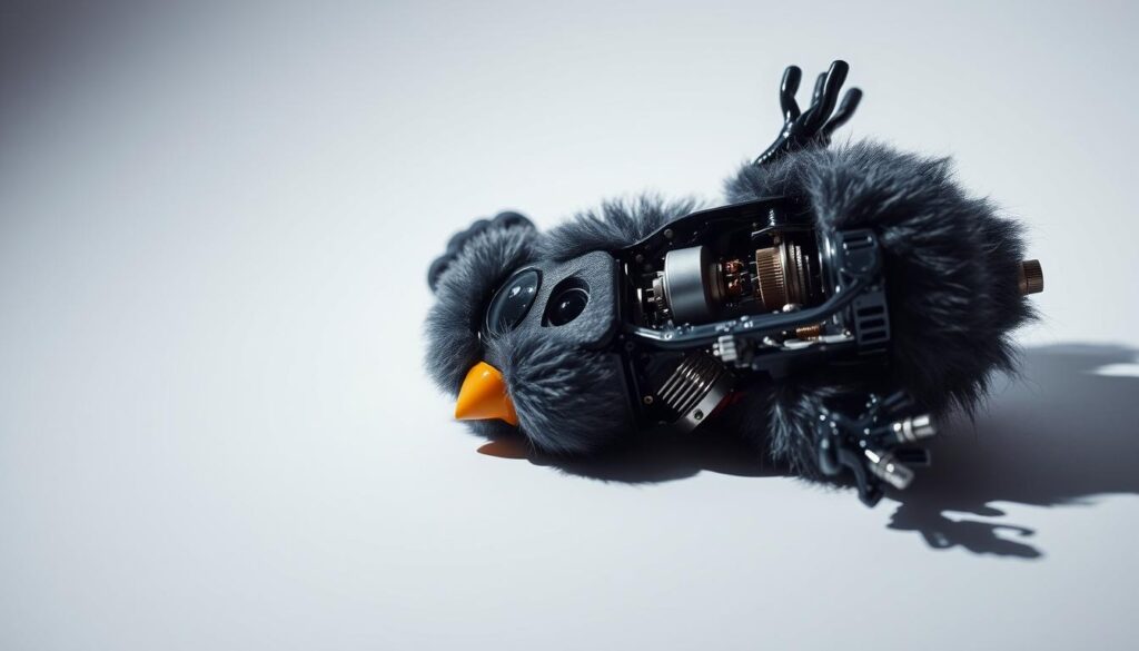 • The exposed internal mechanisms create a compelling juxtaposition between the cute, fuzzy exterior and the mechanical interior.